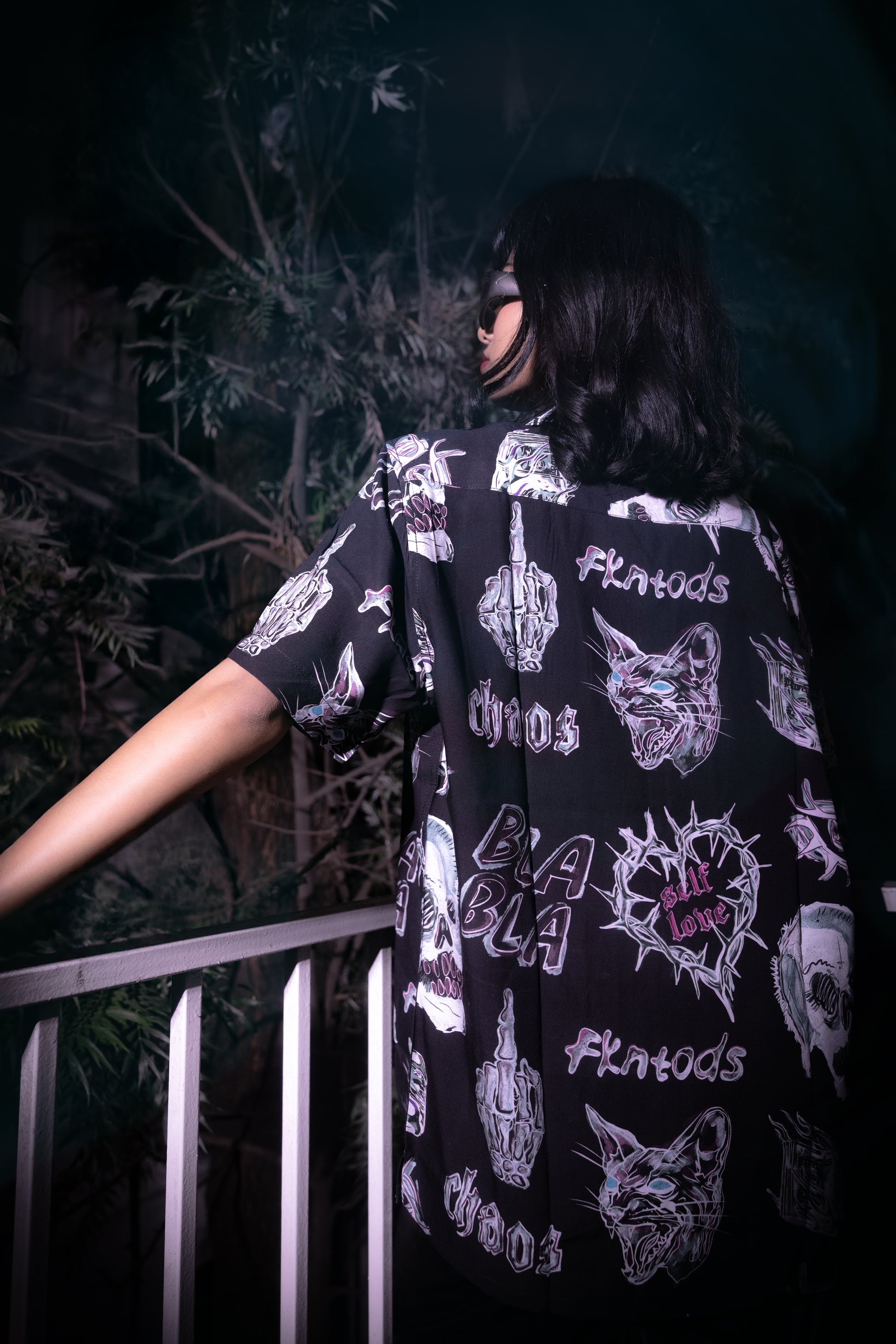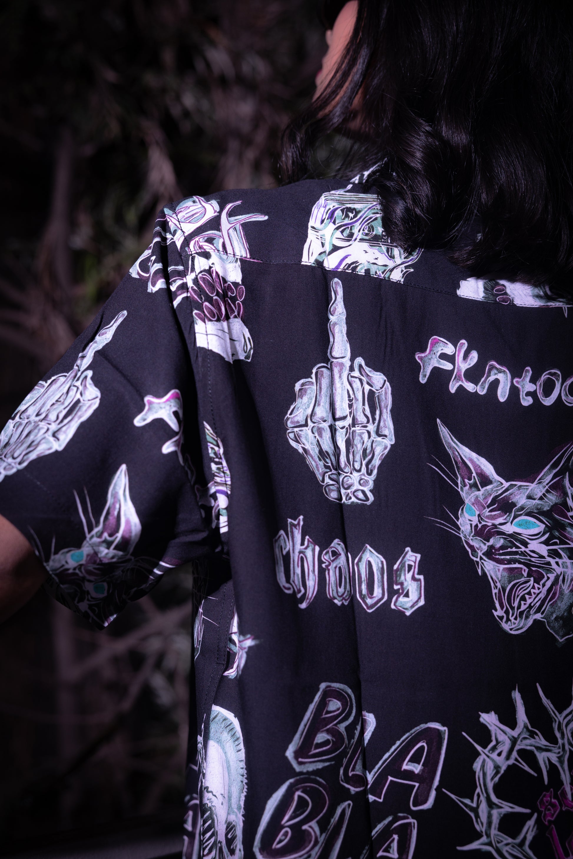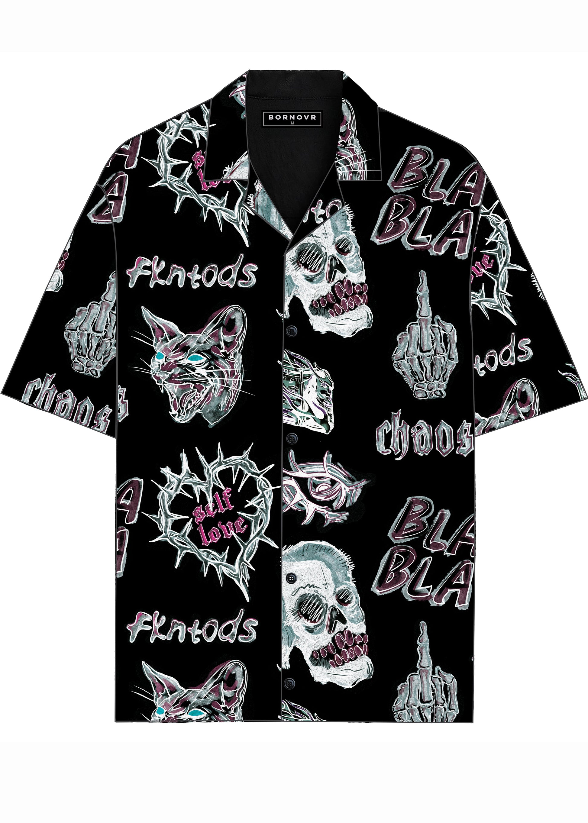 Raise hell in style. FKN TROUBLE is for the bold — a heavyweight statement shirt featuring a chaotic all-over graphic print: skulls, wild cats, barbed thorns, and unapologetic rebellion. Built on a jet-black base, the neon-pink and toxic-green accents hit hard under any light.