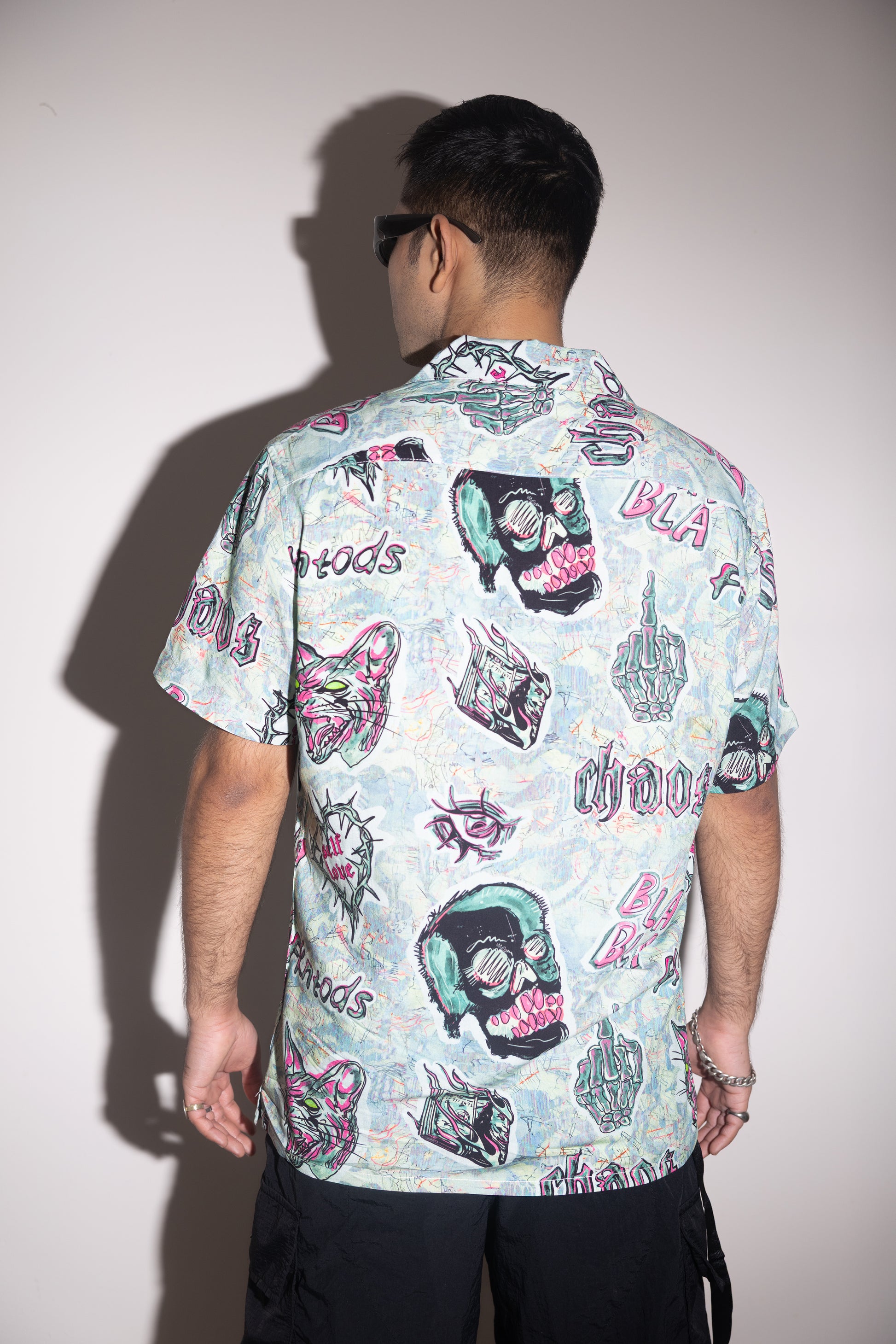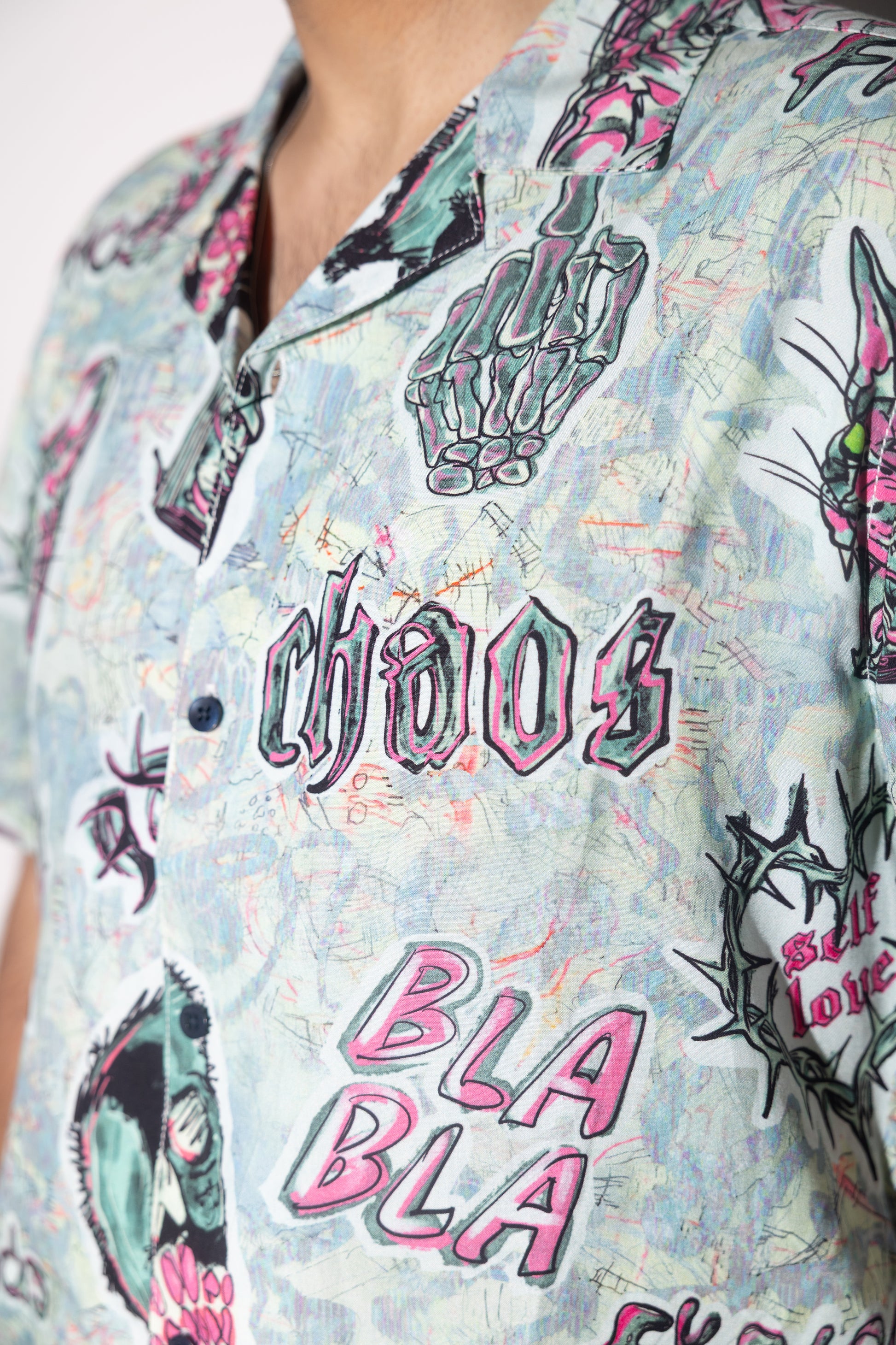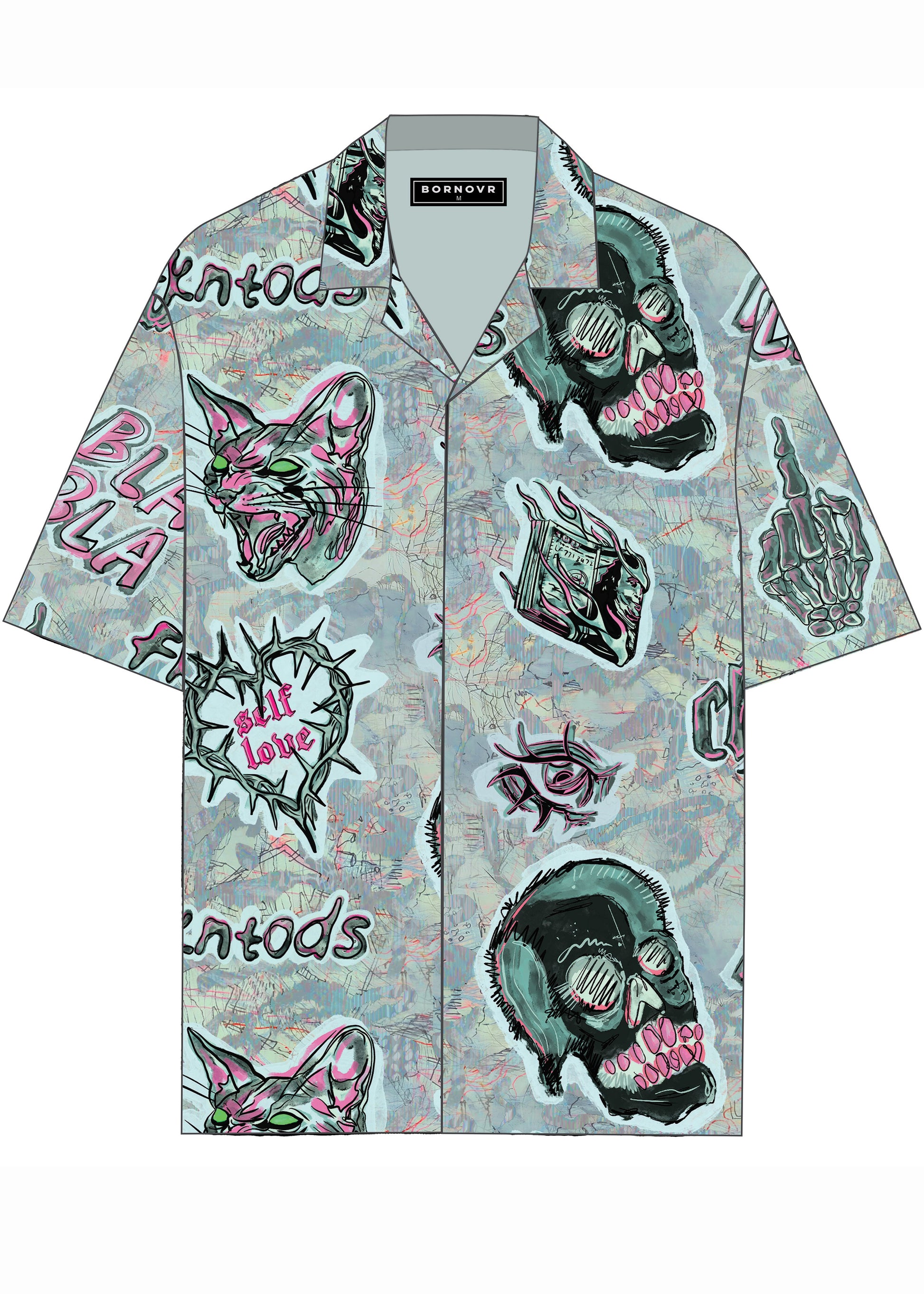 Dark love, sharp edges. The VENOM HEARTS shirt features chaotic hand-drawn graphics : snarling cats, skulls, barbed-wire hearts, and twisted symbols layered over a grunge-inspired backdrop. Made from a lightweight viscose blend, it delivers a smooth drape and breathable comfort while packing a heavy visual punch. With its camp collar and relaxed straight fit, this shirt was built for those who move against the crowd.