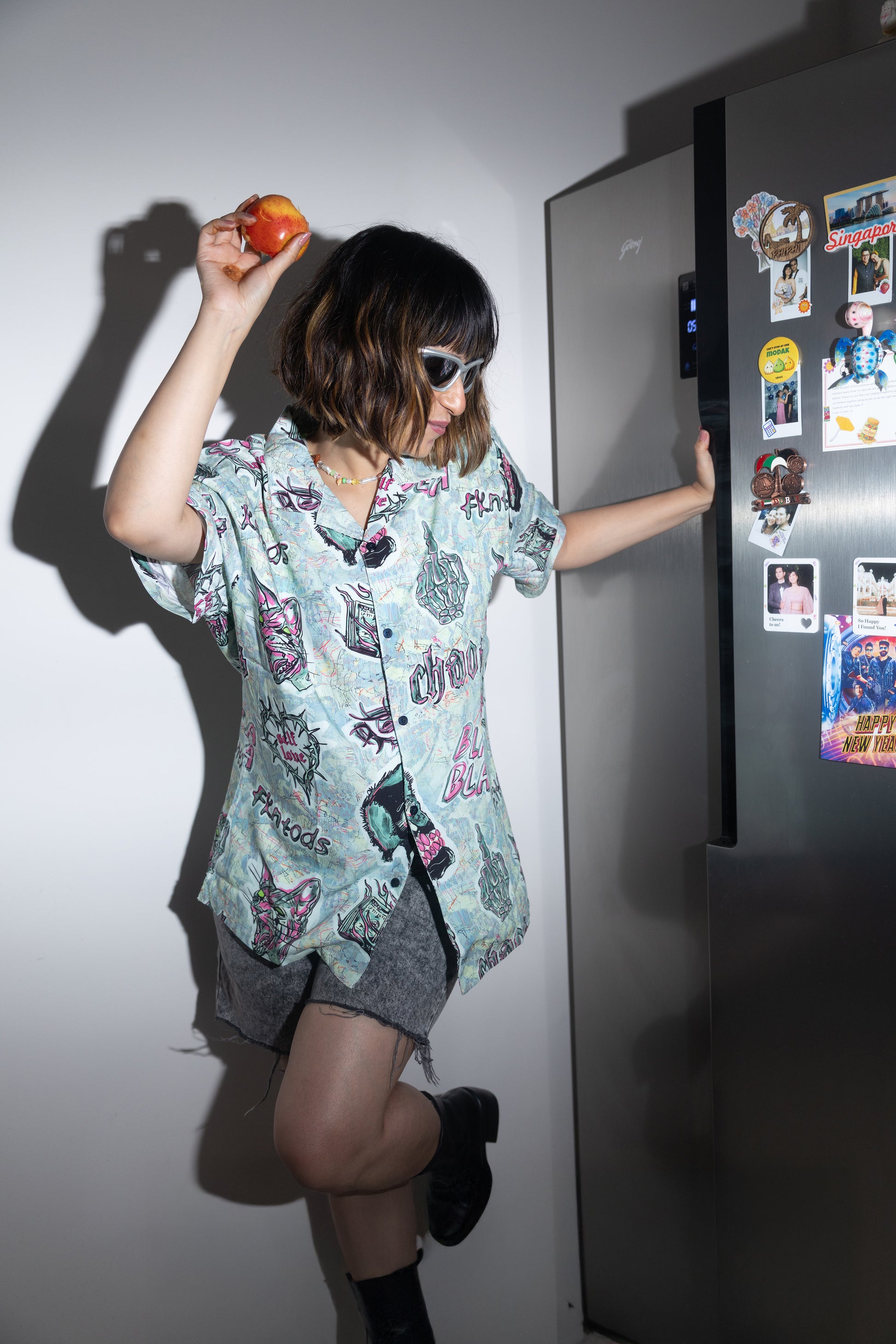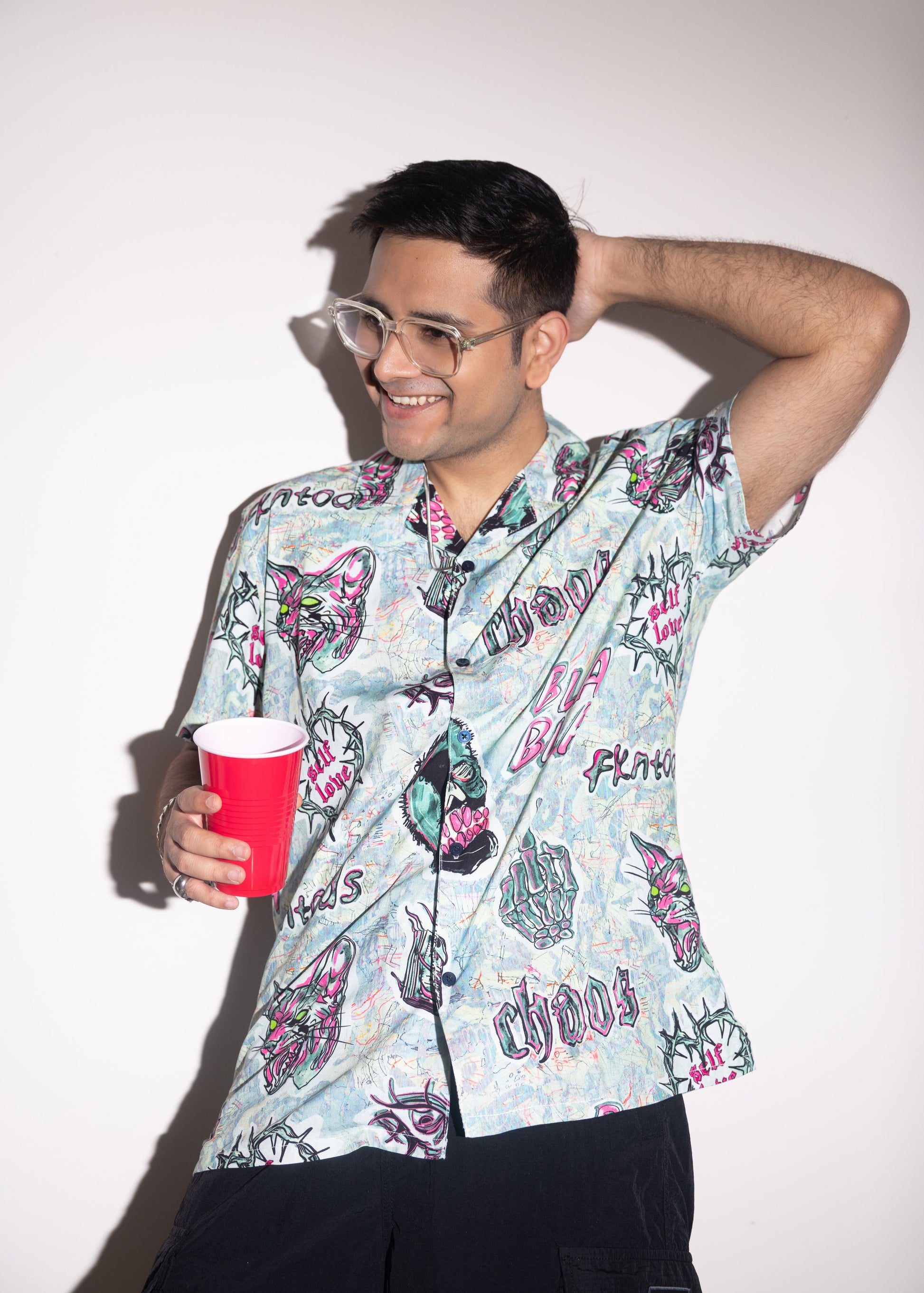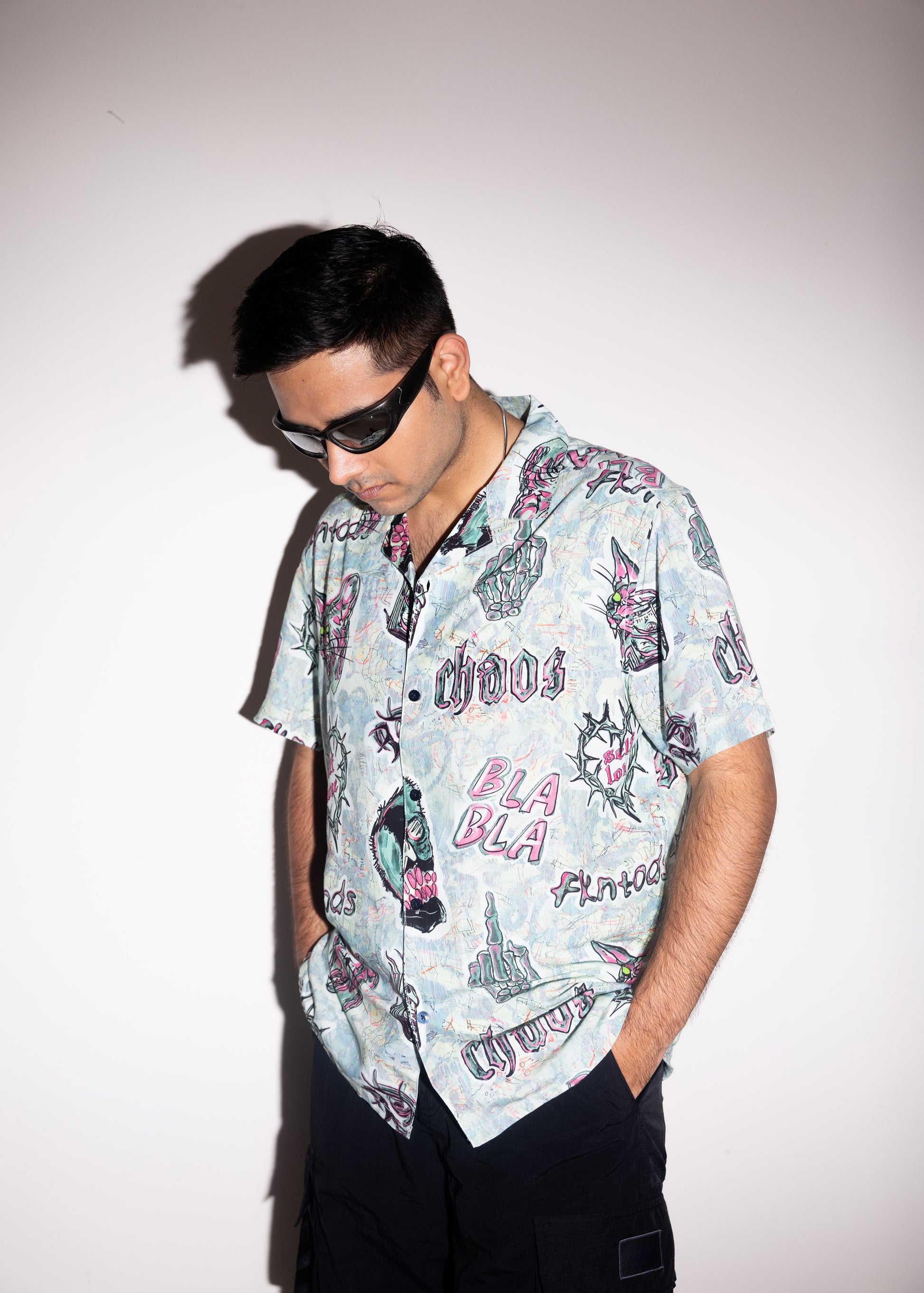Dark love, sharp edges. The VENOM HEARTS shirt features chaotic hand-drawn graphics : snarling cats, skulls, barbed-wire hearts, and twisted symbols layered over a grunge-inspired backdrop. Made from a lightweight viscose blend, it delivers a smooth drape and breathable comfort while packing a heavy visual punch. With its camp collar and relaxed straight fit, this shirt was built for those who move against the crowd.